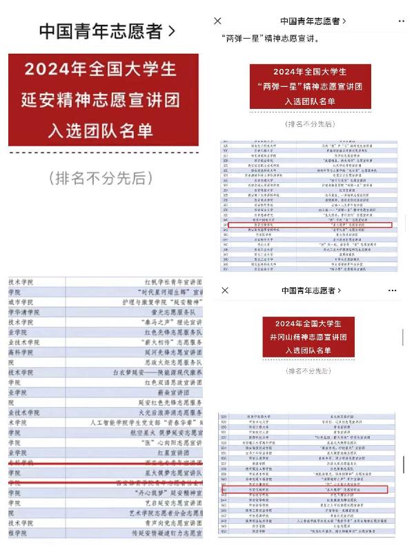 为深入学习宣传贯彻习近平新时代中国特色社会主义思想和党的二十大精神,落实“强国复兴有我”群众性主题宣传教育活动相关要求。近日,相关部门接连公布了2024年全国大学生延安精神志愿宣讲团、2024年全国大学生井冈山精神志愿宣讲团、2024年全国大学生“两弹一星”精神志愿宣讲团入选团队名单,我校“星火筑梦”志愿宣讲队在众多队伍中脱颖而出,连中三元,成绩斐然。
